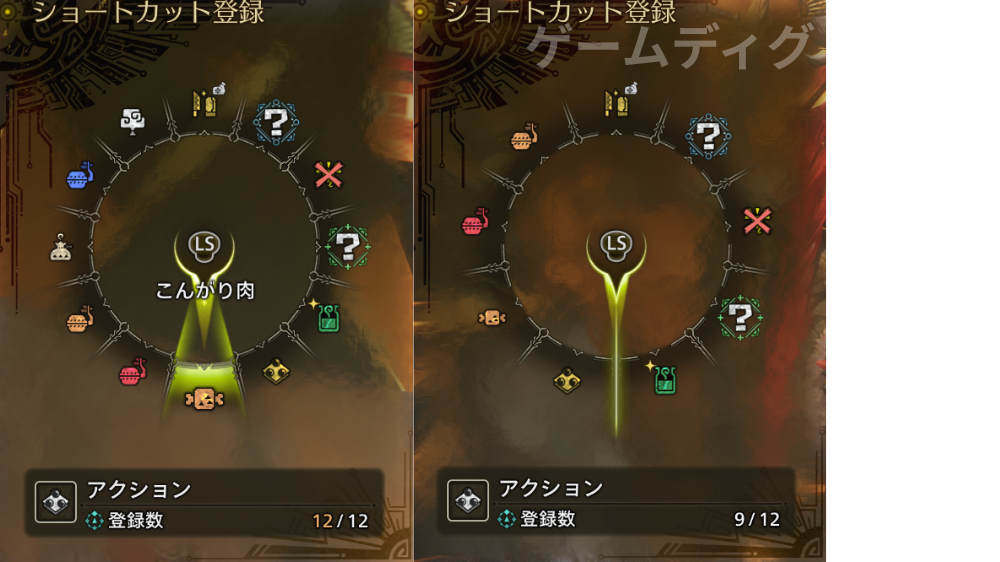 - 登録方向へLスティックを傾けアイテム選択、設定したいものを選ぶ