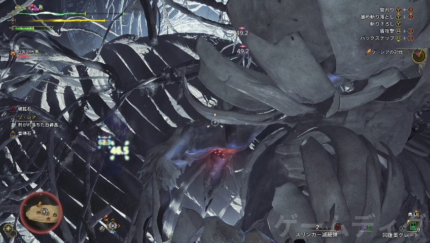 結晶を先にスリンガーで破壊すると炎の延焼を抑えることができます。そして攻撃が始まる前に左右端へ移動しゾ・シアの真横にある結晶を破壊すれば、ダメージを与えつつブレスの後隙を攻撃できます。