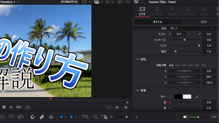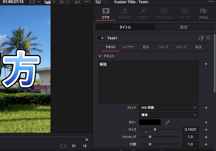 次にタイムラインに置いたテキストをクリックすると右上のインスペクタ画面がテキスト+を編集するモードに切り替わります。