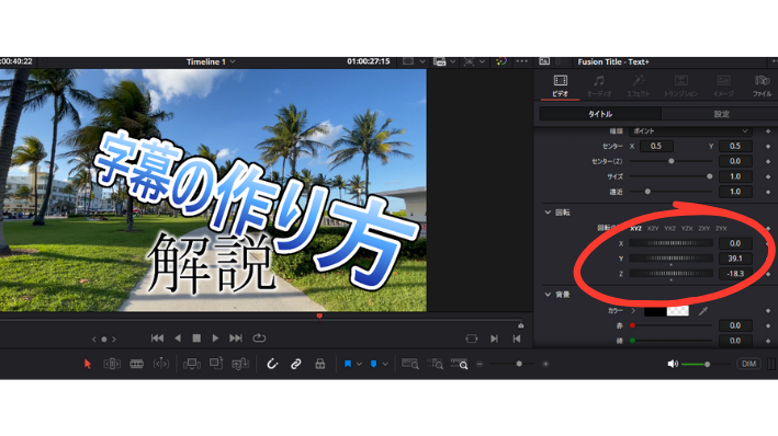 テキストを立体的に表示させることができます。XYZの3つの軸の数値を変えて変更します。例えば奥から斜めに飛び出すように回転させるとテロップが感情的でダイナミックな印象にすることができます。